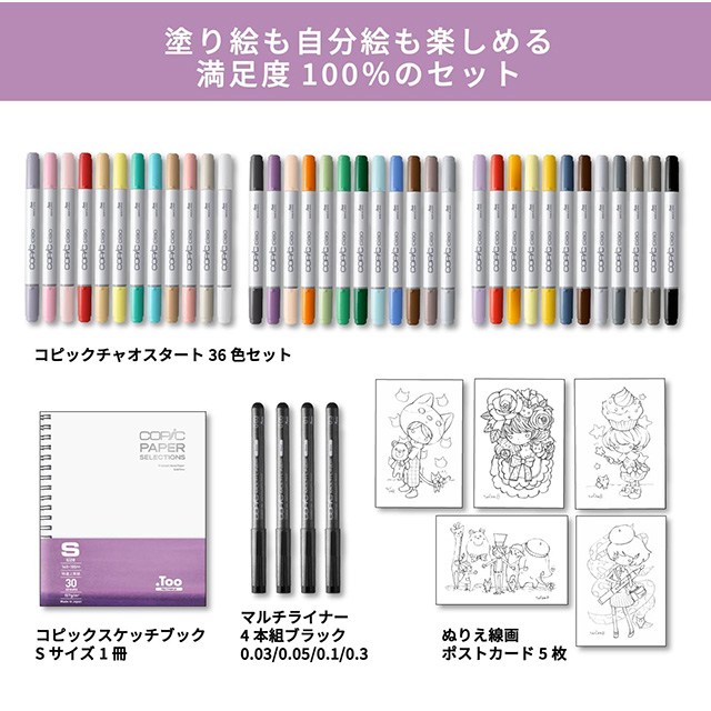 さらに描きおろしポストカード2種とぬりえ線画、コピックの基本が学べるレッスンブックなど、魅力的なアイテムがたっぷり詰まったスペシャルセットです。
