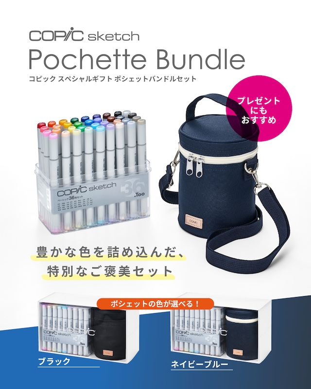 色彩表現の幅を広げる『コピックスケッチ ベーシック36色セット』と、収納や持ち運びに便利な専用ポーチ『コピック ポシェット』を組み合わせた、実用的な限定ギフトセット。