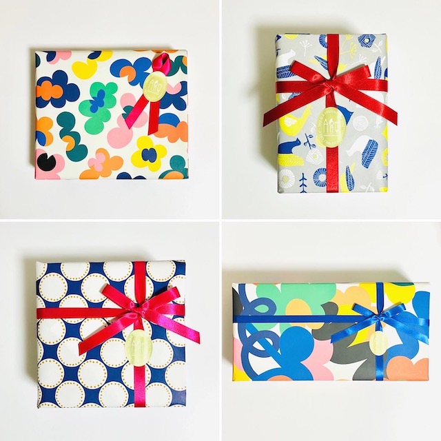 ラッピングには、世界中のおしゃれで可愛い包装紙の専門店、『レガーロパピロ』のオリジナルペーパーを使用。リボンの色も、ペーパーの色に合わせてコーディネートしました。