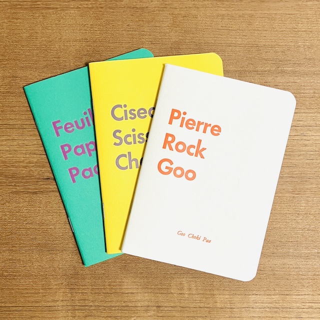 フランス語・英語・日本語の『グー』『チョキ』『パー』が、活版印刷とリソグラフで印刷された、とってもユニークなミニノートです。