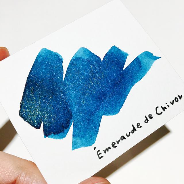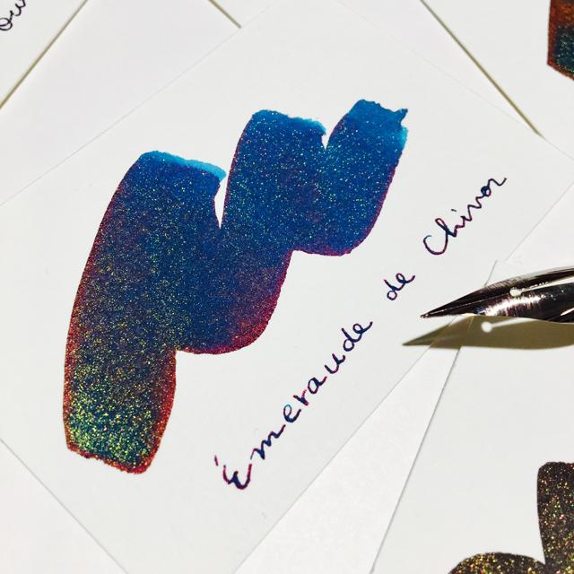 アニバーサリーインクは使用量や紙の種類により、本来のものとは異なる色が現れる現象 (フラッシュ) が起こります。カラーサンプルにはウィンザー&ニュートンの水彩紙『コットマン』中目 を使用し "インク溜まり" ができるよう、筆を使って多めにインクを載せています。
