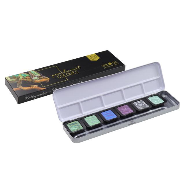 ドイツ製の高品質な固形水彩絵具、FINETEC (ファインテック)。こちらは不透明のパールカラーが5色と、ユニークにきらめく『Flip-Flopカラー』が1色入った6色セットです。