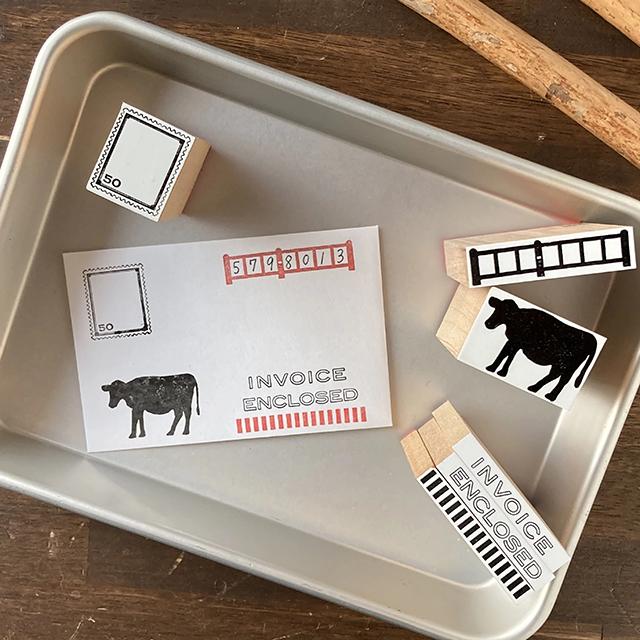 牛のはんこ はもちろん、お弁当の仕切りに使う "バラン" のはんこ を牧草に見立てて組み合わせても楽しい !