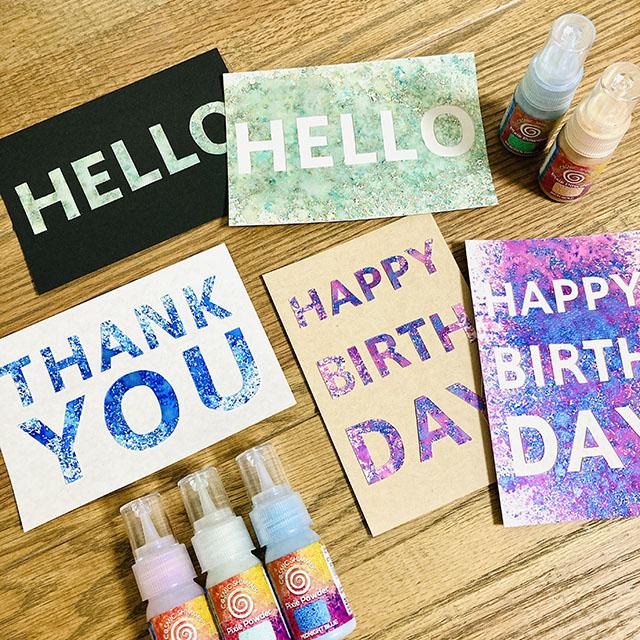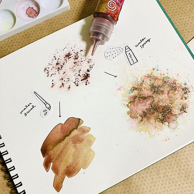 紙にささっとパウダーを振りかけて霧吹きなどで水をスプレーすると、はっとするほどまばゆく鮮やか… !