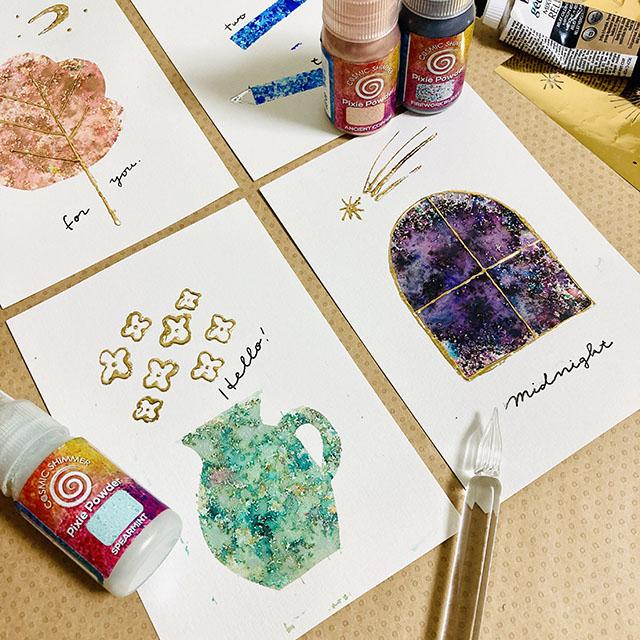 紙にささっとパウダーを振りかけて霧吹きなどで水をスプレーすると、はっとするほどまばゆく鮮やか… !