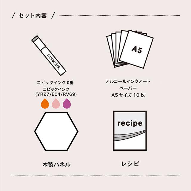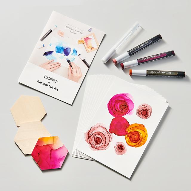 その手軽さと、意図せずに現れる不思議な模様、仕上がりの美しさ…魅力いっぱいのアルコールインクアートに必要なアイテムがそろった、とっても楽しいキットです。