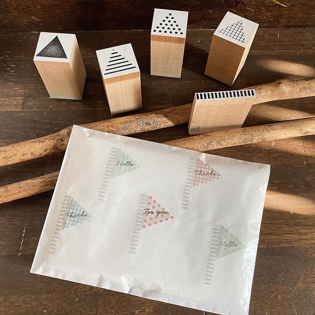 手作りカードやラッピングのアクセントに使いやすい、三角形のはんこです。背景にしても良し、イラストを描いて合わせても良し。