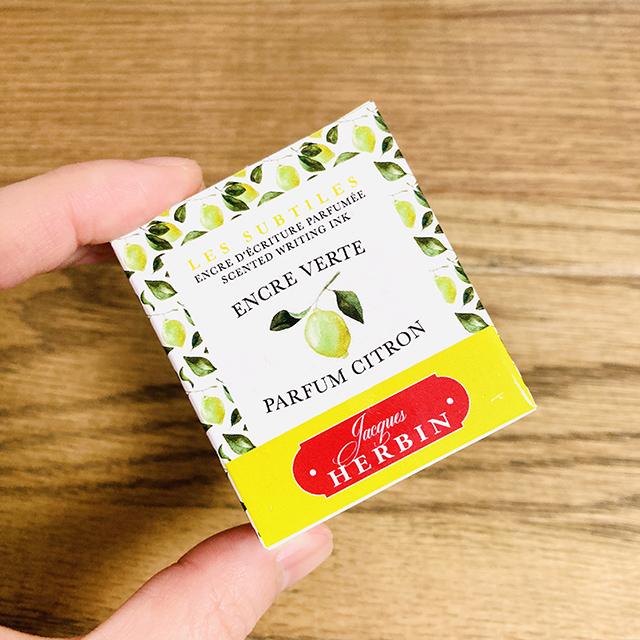 鮮やかに発色するレモングリーンの色味と、インクラベル&箱全体に描かれたレモンのデザインがとってもステキ。