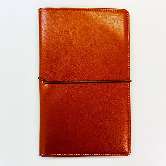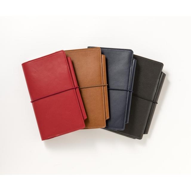 無地のノートが1冊入ったシンプルなノートカバーには、持ち歩きに便利なペンホルダーと、パスポート・カードが入れられるポケット付き。