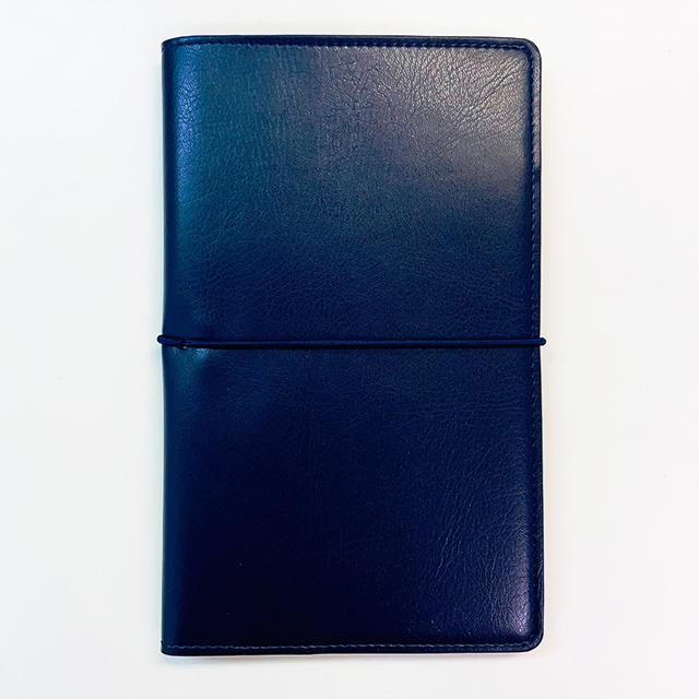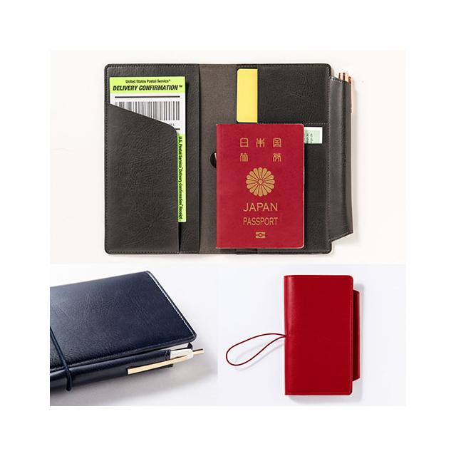 無地のノートが1冊入ったシンプルなノートカバーには、持ち歩きに便利なペンホルダーと、パスポート・カードが入れられるポケット付き。