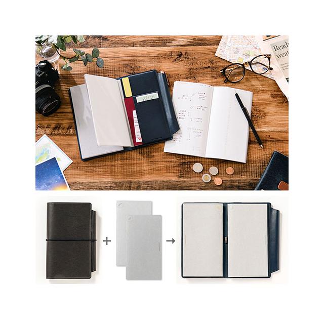 無地のノートが1冊入ったシンプルなノートカバーには、持ち歩きに便利なペンホルダーと、パスポート・カードが入れられるポケット付き。