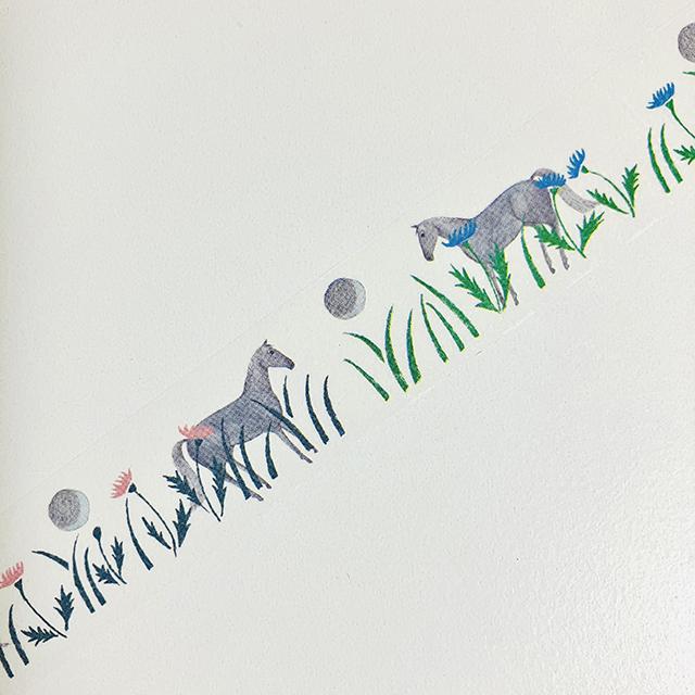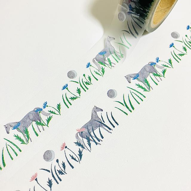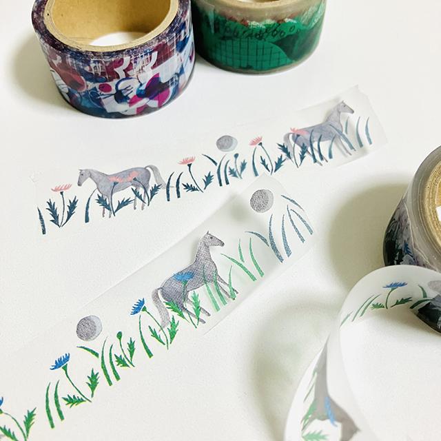 繊細なタッチで描かれた馬と花畑の幻想的なイラストが、儚げでとってもステキ… !まるで童話のような世界観が魅力のイラストレーター、西淑 (nishi shyku) さんの透明マスキングテープ。