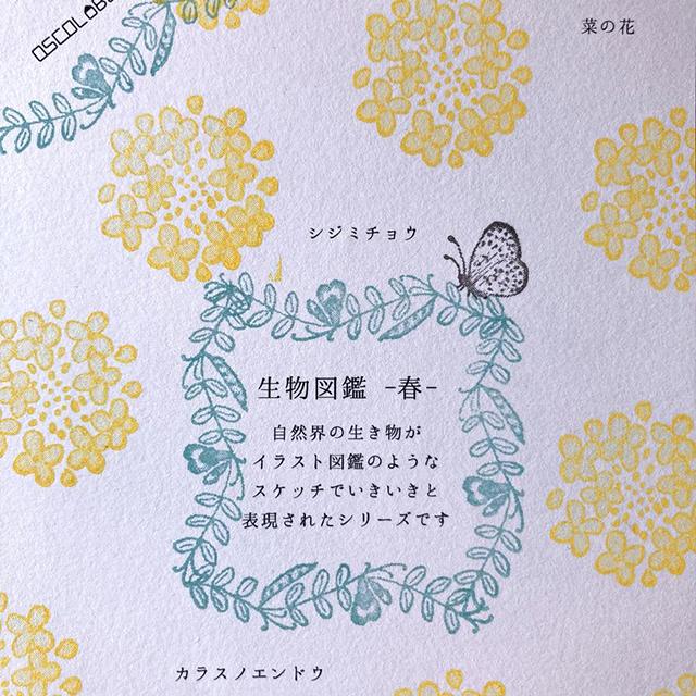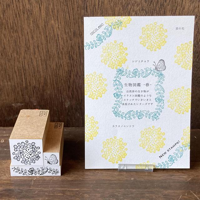 自然界の生きものや植物が線画でリアルに表現されたスタンプ。使い勝手のいいサイズ感です。菜の花のモチーフは春のムードたっぷり。