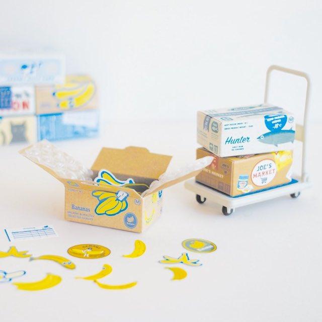 手のひらサイズの小さな段ボールに、シールがたっぷり ! オモシロ可愛い、ハコシール。
