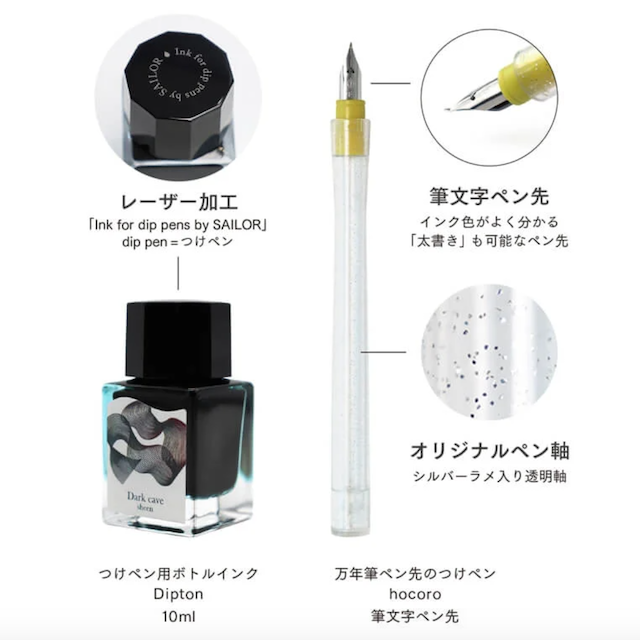 これだけですぐにシーンインクを楽しめる ! 『 Dipton 』のミニボトルと、万年筆ペン先のつけペン『 hocoro 』の限定セットです。