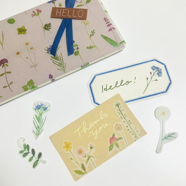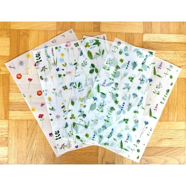 色とりどりのお花が降っているような『ガーデン』、素朴さが愛らしい『ノノハナ』、さまざまな形の葉っぱが可愛い『グリーン』、爽やかさを纏った『ハーブ』、全4柄を少しずつ楽しめるアソートパック。
