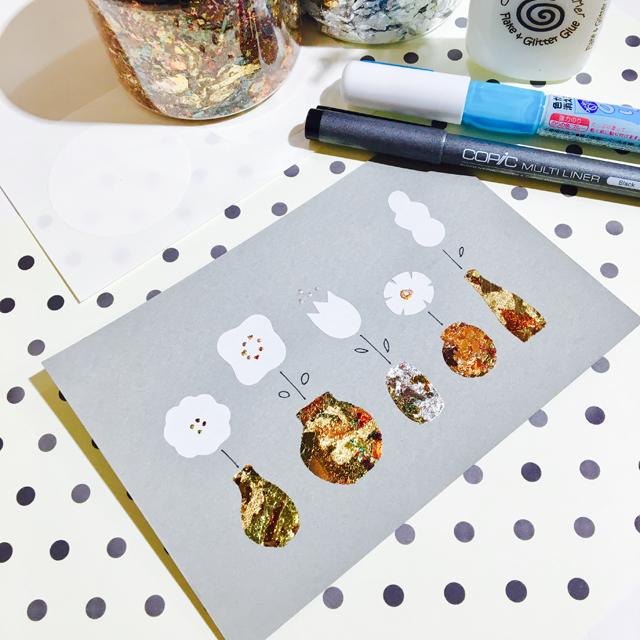 糊で直接絵や文字を描いたところにカラーパウダーや キラキラのアルミフレーク をまぶして、デコレーションしても◎