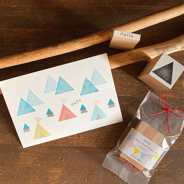 無地、しましま、水玉、3柄の小さな三角はんこがそろいました。