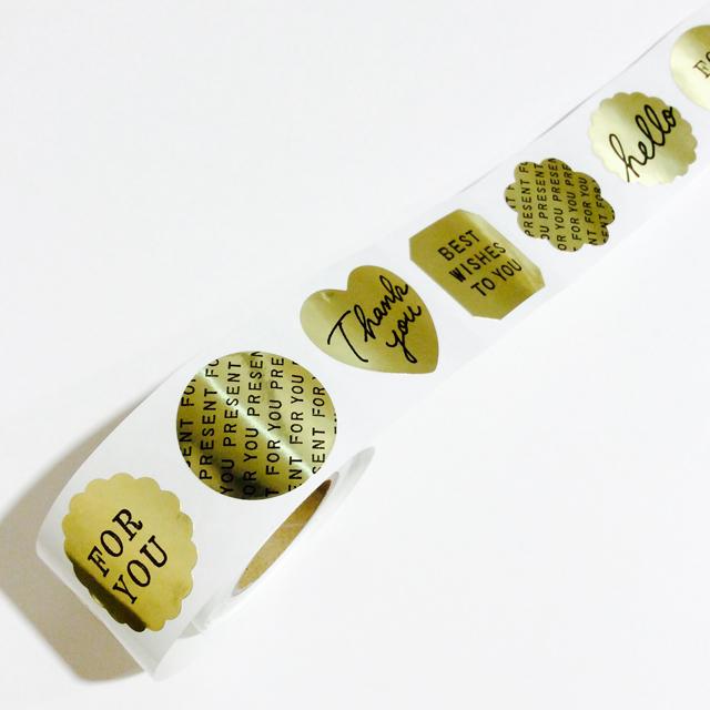 11種類のデザインがアソートになった、ロールタイプのシールです。メタリックゴールドのマルや四角、ハート型などなど。