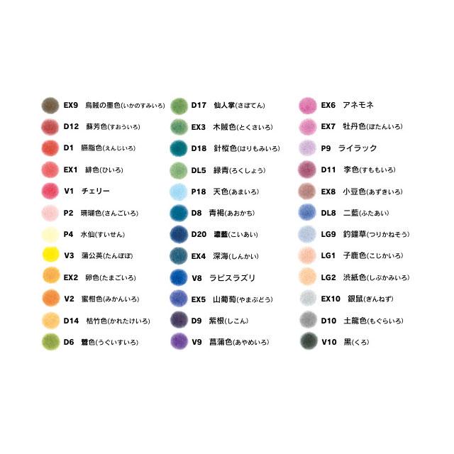 ① 緋色(ひいろ) ② 卵色(たまごいろ) ③ 木賊色(とくさいろ) ④ 深海(しんかい) ⑤ 山葡萄(やまぶどう) ⑥ アネモネ ⑦ 牡丹色(ぼたんいろ) ⑧ 小豆色(あずきいろ) ⑨ 烏賊の墨色(いかのすみいろ) ⑩ 銀鼠(ぎんねず) ⑪ 臙脂色(えんじいろ) ⑫ 鶯色(うぐいすいろ) ⑬ 青褐(あおかち) ⑭ 紫根(しこん) ⑮ 土龍色(もぐらいろ) ⑯ 李色(すももいろ) ⑰ 蘇芳色(すおういろ) ⑱ 枯竹色(かれたけいろ) ⑲ 仙人掌(さぼてん) ⑳ 針樅色(はりもみいろ) ㉑ 濃藍(こいあい) ㉒ 緑青(ろくしょう) ㉓ 二藍(ふたあい) ㉔ 子鹿色(こじかいろ) ㉕ 渋紙色(しぶかみいろ) ㉖ 釣鐘草(つりがねそう) ㉗ 珊瑚色(さんごいろ) ㉘ 水仙(すいせん) ㉙ ライラック ㉚ 天色(あまいろ) ㉛ チェリー ㉜ 蜜柑色(みかんいろ) ㉝ 蒲公英(たんぽぽ) ㉞ ラピスラズリ ㉟ 菖蒲色(あやめいろ) ㊱ 黒