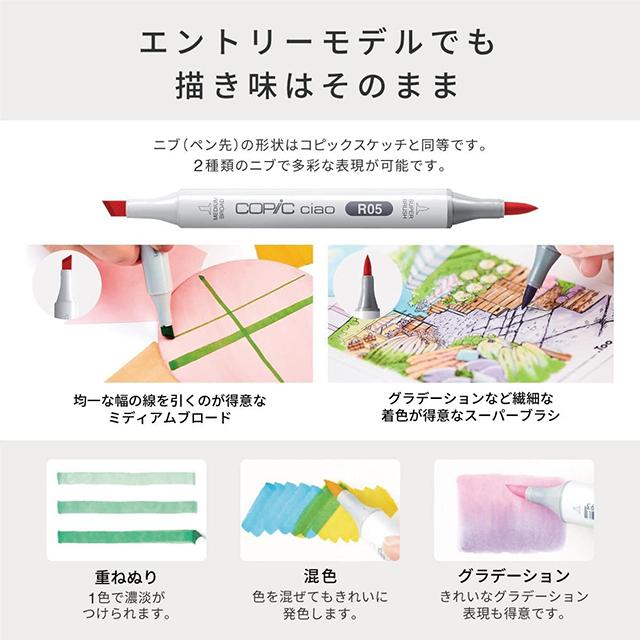 「コピックを使ってみたいけれど、色数が多すぎて何色を選べばいいのかわからない」「コピックで手軽にぬり絵を楽しみたい」そんな方にぴったりのスターターセットができました !筆タイプ&太描きタイプのツインアルコールマーカー、コピックチャオ全180色の中から、初心者さんにも使いやすい10色をセレクト。人物画にも風景画にも使いやすい薄めの色組みなので、何度か塗り重ねるといろいろな表情を楽しめます。
