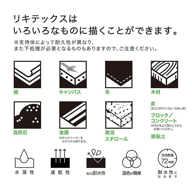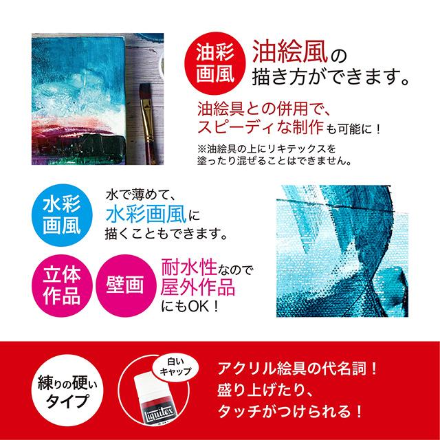 チューブから出してそのままナイフでタッチがつけられるくらいの硬さに調整してあります。油彩風のタッチを生かした描き方には最適です。水や各種メディウムを混ぜて、硬さを変えたりテクスチュアをつけたり自由に調整できます。