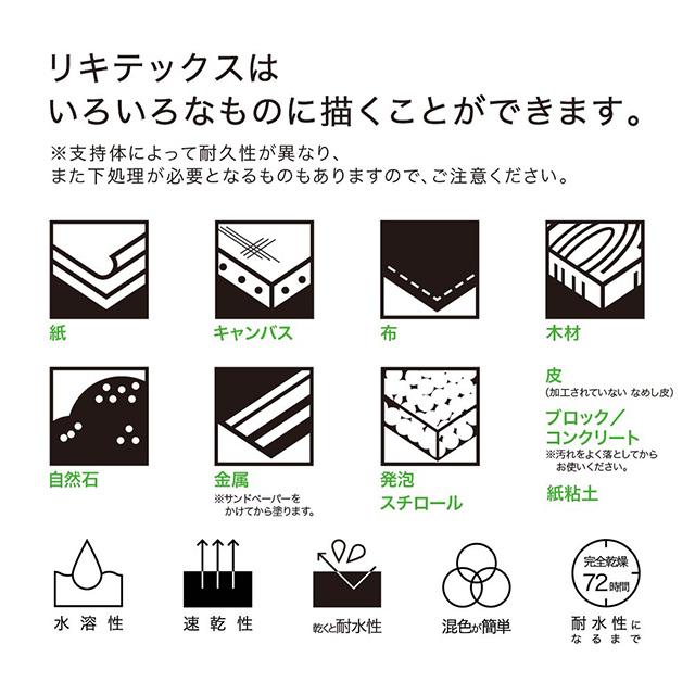 リキテックスソフトタイプはレギュラータイプのように練り調子が硬くなく、サラッとした乳液状の絵具です。顔料濃度が高いので平塗りでムラになりにくく、水で薄めるのも大変簡単です。エアブラシに特に使いやすく、ハードエッジ技法や色を薄くかさねていくリアルイラストなどにも最適です。 メディウムはレギュラータイプと共通で、色数は蛍光色6色を含む全112色です。