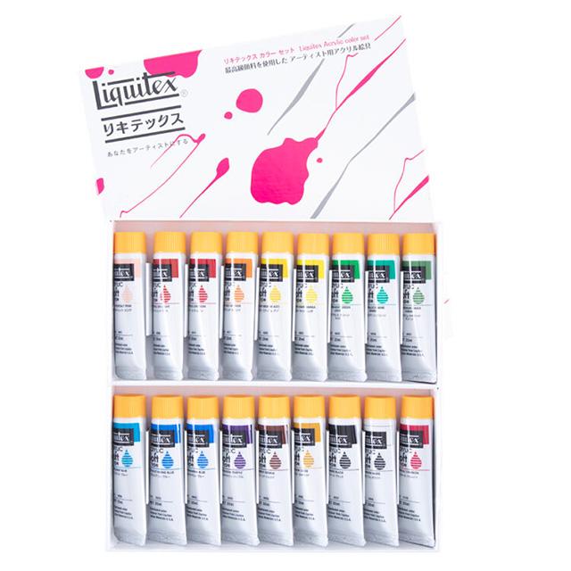 001:ライトポートレイトピンク / 008:ナフソールレッドライト / 010:ナフソールクリムソン / 150:ピロールクリムソン / 017:ビビッドレッドオレンジ / 020:イエローミディアムアゾ / 021:イエローライトハンザ / 027:パーマネントグリーンライト / 030:フタロシアニングリーン / 031:クロミウムオキサイドグリーン / 036:ブリリアントブルー / 042:フタロシアニンブルー / 043:ウルトラマリンブルー / 045:ディオキサジンパープル / 050:バーントシェンナ / 052:イエローオキサイド / 057:マースブラック / 065:チタニウムホワイト