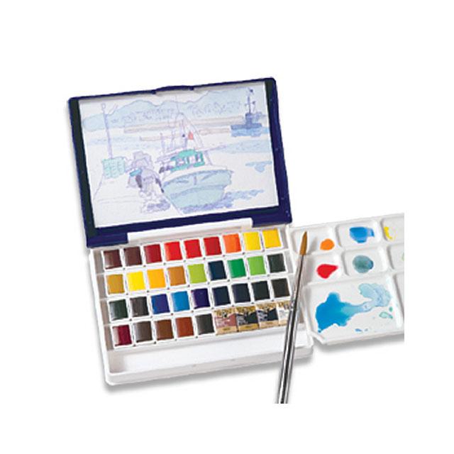おしゃれな樹脂ケースにパンカラーと水彩筆をコンパクトにセット。