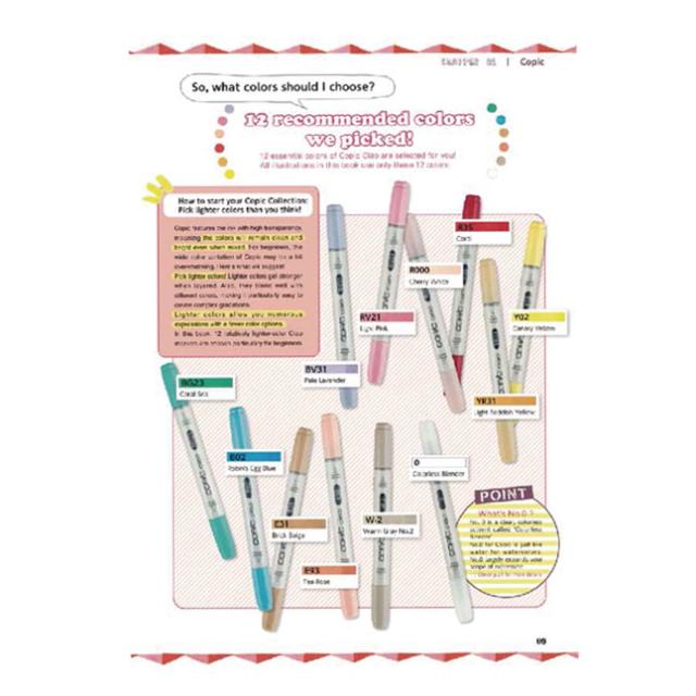 初心者の方が迷いがちな画材の選び方から、ぼかしやグラデーション、混色といった基本テクニック、さらにキャラクターの塗り方までをこの1冊にコンパクトにまとめました。その他、服の柄や背景の表現方法など、バリエーションアイデアも豊富に収録しております。大人気コピック公式ガイド「12色でスタート!はじめてのコピックイラスト(マール社刊)」の英語版です。日本語版よりも大きなサイズで、より写真が見やすくなっています。また、本書で使われる12色は「コピックチャオ スタート12色セット」となっております。