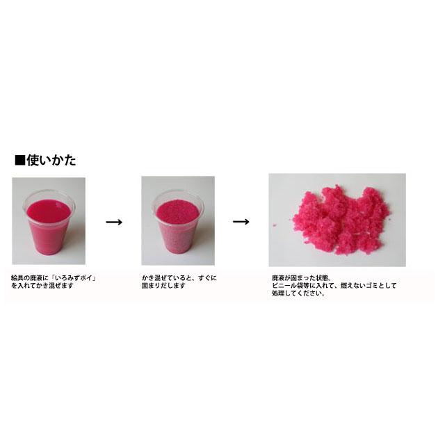 絵具の廃液に「いろみずポイ」を入れてかき混ぜるだけで、すぐに廃液が固まります。