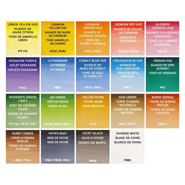 アマチュアから、大量の絵具を必要とするプロのアーチストまで満足できる、高品質の水彩絵具です。チューブから出した色、薄く引き伸ばした時の色、顔料の強度と着色力、そして透明度を考慮に入れて選び抜かれた色彩です。堅牢度が非常に高く、全40色が「専門家用堅牢度」のAAまたはAにランクされています。上位シリーズのW&Nアーチスト・ウォーターカラーと混ぜることもできます。