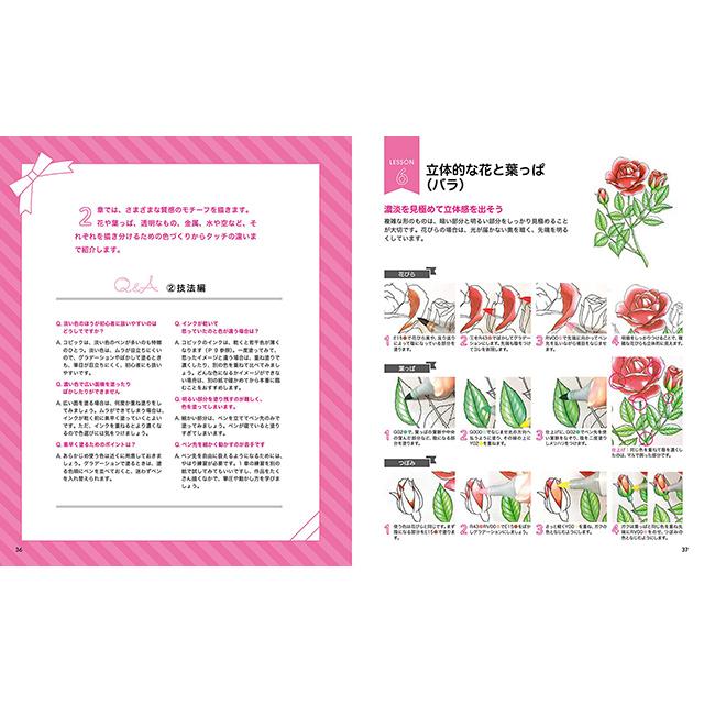 本書では、「ムラなく塗る」「混色する」「グラデーション」など初歩的なレッスンから、さまざまな素材の塗り分け、人物の肌や服の表現まで、さまざまな課題を楽しく塗りながら進めることができます。「塗り方手順・完成画・下絵」がセットになった30のレッスンを掲載しているので、レッスンが終わるころには、コピックを自由自在に扱えるようになっているはず。下絵の裏は白い状態なので、本から切り離して塗ってもOKです。