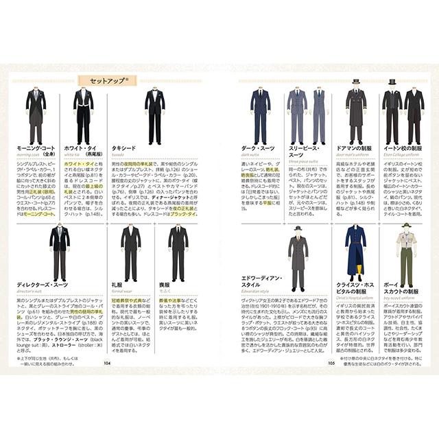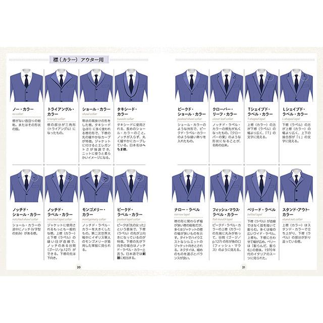 本書は、襟や首回り、袖口のデザイン、ネクタイの結び方やアクセサリーの種類、帽子や靴などの小物類、スーツなどのセットアップ、着こなしやドレスコードにまつわるコラムなど、メンズファッションの用語や特徴をわかりやすく解説したイラスト図鑑です。