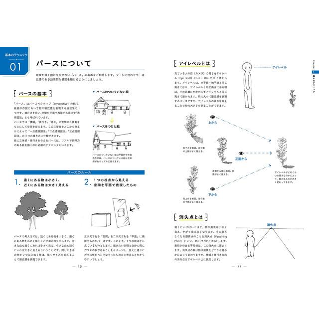 イラストや漫画を描くときに、一番つまずきがちなのが背景の描写、という人は多いのではないでしょうか。本書は簡単に描ける目安線を使って、本格的な背景パーツの描き方が学べる一冊です。背景を描くうえで知っておきたい基本のテクニックから、「自然物」「人工物」「表現・効果」の3つのテーマで、背景パーツの描き方をメイキング形式で丁寧に解説します。また、応用編として2章?4章を踏まえて1枚絵を完成させる方法や、PCに画像を取り込んで補正する方法なども紹介しています。