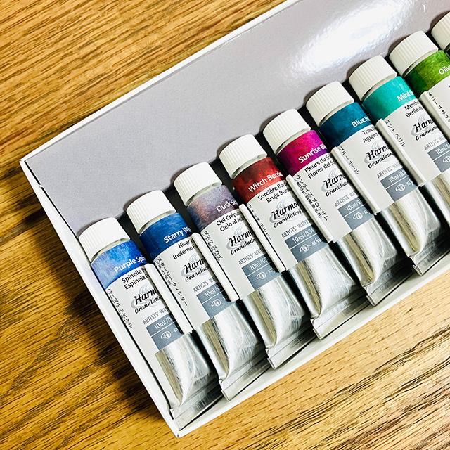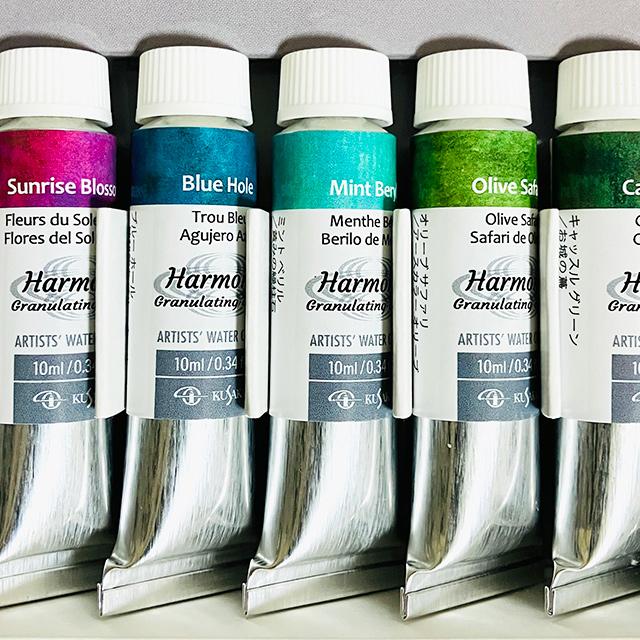 ざらっとした独特のマチエールを作り出すグラニュレーションカラーでもあるハルモニア透明水彩絵具。