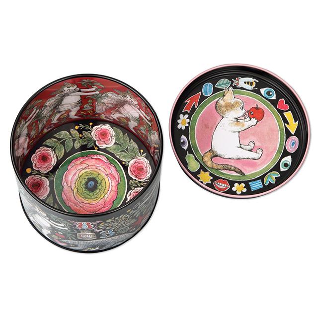 どこを眺めてもたまらなくかわいい、老舗画材メーカー・ホルベイン×ヒグチユウコさんコラボレーションの丸いブリキ缶です。