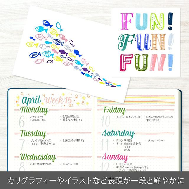 イラスト、カリグラフィー、メッセージカードなどの用途に便利です。鮮やかな発色の水性染料インキ使用。