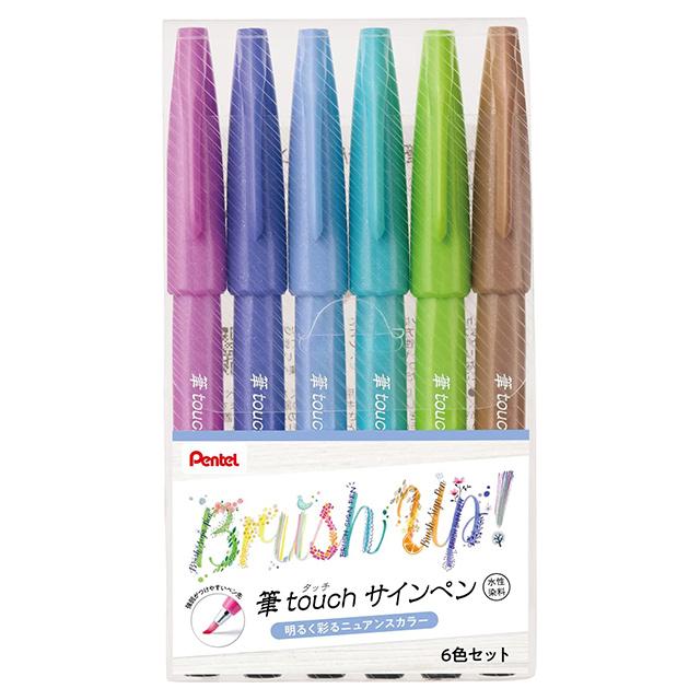 筆のような筆記感が楽しめる「筆タッチサインペン」明るく彩るニュアンスカラー配色の6色セット。
