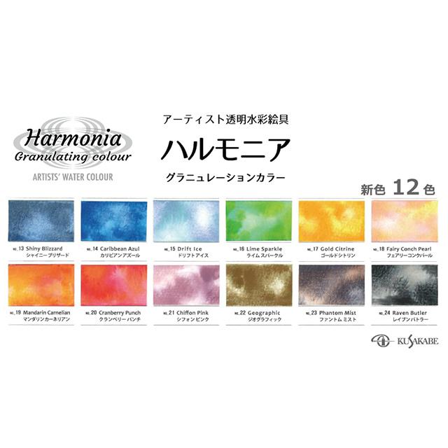 名前の由来は、『調和』を表すハーモニー。2つ以上の色の顔料が、絶妙に分離するよう調合されています。水の量などによっても変化する色彩は美しく、とってもユニーク。色につけられたロマンチックな名前も素敵です。1色でもあらゆる彩色がしっくり決まる、魅惑の透明水彩絵具。新色12色が加わり、ラインアップは全24色となりました。