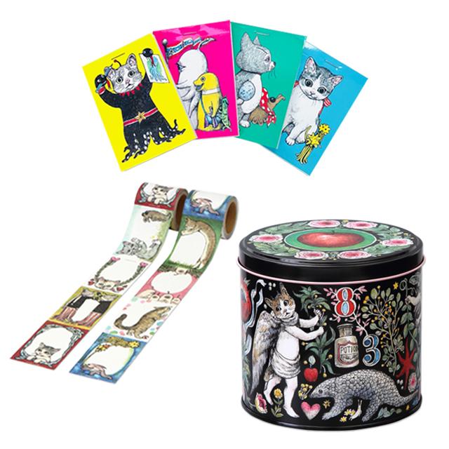 老舗画材メーカー・ホルベインとヒグチユウコさんの2022年コラボレーションアイテム、人気の丸缶・ロールふせん・ミニメモ帳がぜんぶ詰まったちょっぴりお得なセットです。