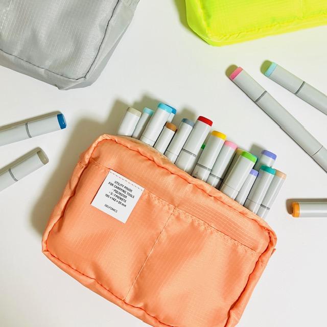 ペン・マーカー・絵具など、画材や文具の収納にはもちろん、ケーブルやバッテリーなどかさばりがちなガジェットアイテム、旅行のアメニティ収納にもオススメ。内容によって色を分けて使っても良いですね。