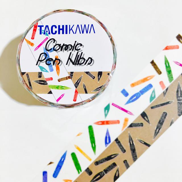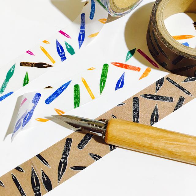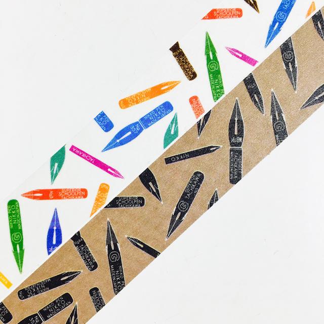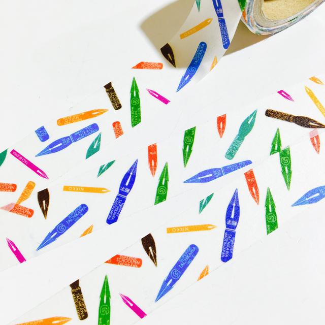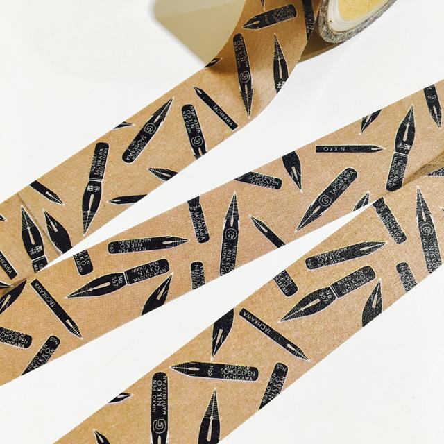 漫画やイラストを描く人にはお馴染み、タチカワとニッコーのペン先がそのままマスキングテープになりました。Gペン・丸ペン・かぶらペンがランダムに配置された楽しい柄と、刻印までしっかり再現されたデザインの細かさは、画材好きにはたまらないアイテムです。