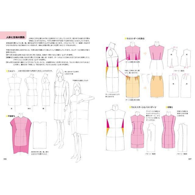 人が服を着ると、どこに、どのようなシワができるのか、デザインとして入れるシワ(ギャザーやドレープなど)とはどう違うのか、立体的な構造の洋服に必須のダーツやタックについても触れています。