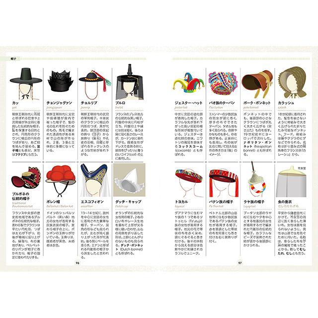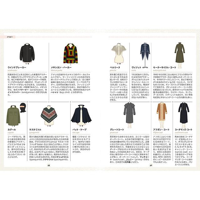 前書に入りきらなかったものはもちろん、民族衣装やベビー服、アクセサリーパーツなど、分野を広げることで見つかった、とてもたくさんのアイテムたち。その中から、一般的な用語として広く使われているアイテムを選び、1140点以上収録しています。