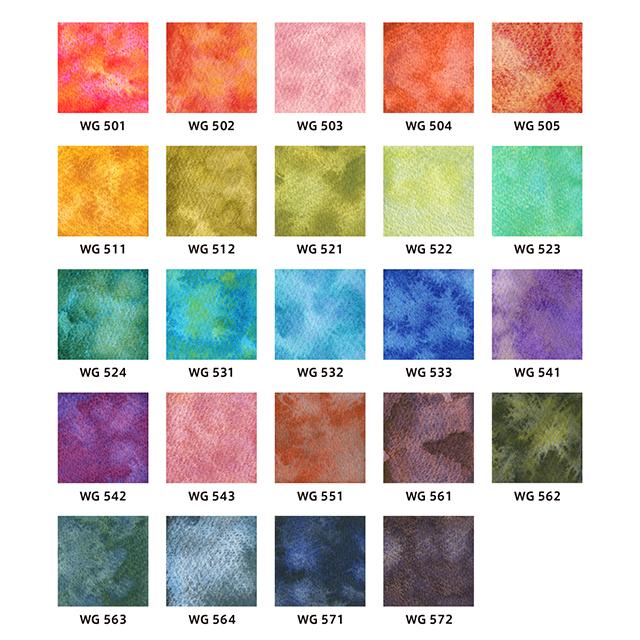 自然の風景や動植物から着想を得たグラニュレーティングカラーズは、穏やかな色の分離からホルベインらしい彩度の高い色まで幅広い色を取り揃えています。