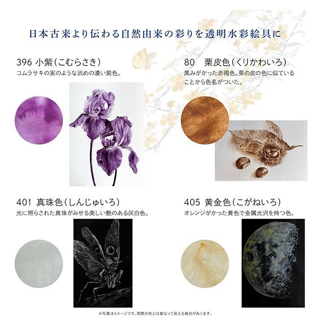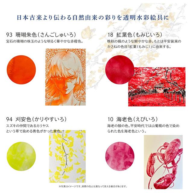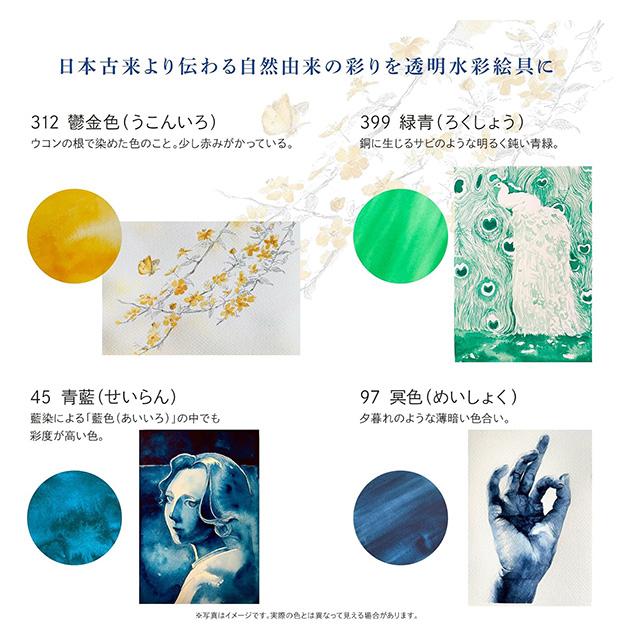 日本古来より伝わる和名の彩りを透明水彩絵具に。伝統的な色とその色名をお楽しみください。