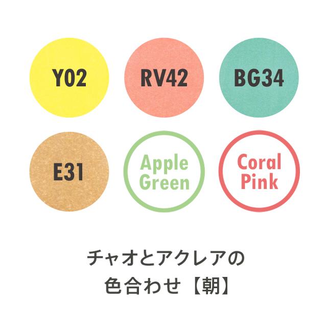 いつもとちょっと趣向を変えて、コピックチャオ 4色とアクレア 2色の組み合わせで 1 日のイラストが描ける、 使いやすくて楽しい色組みです。