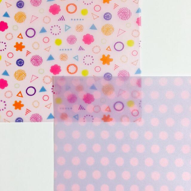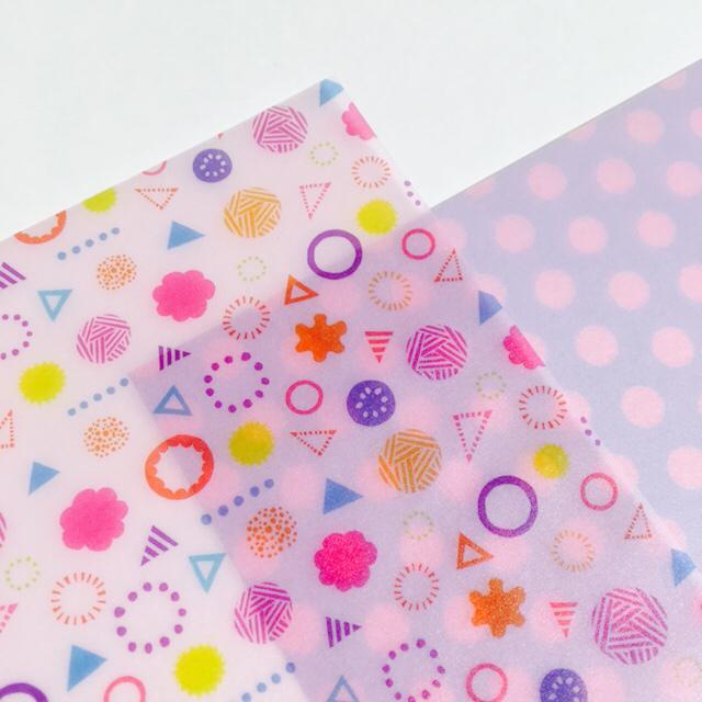 トレペ特有の透け感に、全体にちりばめられたパターン模様がとてもマッチングしています。オリガミとしてはもちろん、ラッピングやコラージュ素材、小さくカットしてメッセージカードなど、使い方イロイロ大活躍のアイテムです。