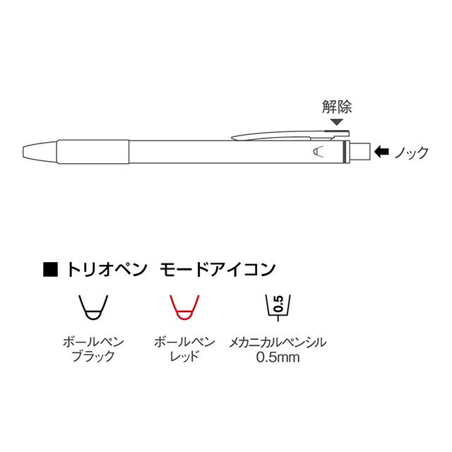 ボールペン黒・赤と、0.5mmメカニカルペンシルの3機能が備わった「トリオペン」。
